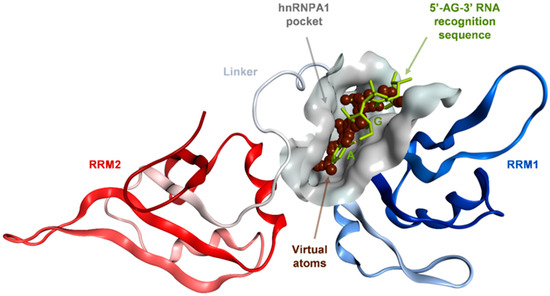 The published 1.92 Å X-ray structure of the UP1 RNA-binding domain (RBD) of hnRNP A1 bound to its RNA 5′-AGU-3′ trinucleotide target sequence (PDB ID: 4YOE) [34] was utilized for identification of plausible pockets where small molecule inhibitors could bind and specifically disrupt hnRNP A1 binding to RNA and, therefore, to interfere with the subsequent splicing activities. The 4YOE X-ray structure provided the first insights into the specificity of hnRNP A1–RNA recognition which indicated that UP1 specifically interacts with the 5′-AG-3′ ribodinucleotide within a nucleobase cavity formed upon folding of the RRM1 motif and the inter-RRM linker. RRM2 made no contact with the RNA sequence. Both A (adenine) and G (guanine) purines engaged in stereospecific contacts within the pocket thus explaining the preference for the 5′-AG-3′ sequence [34]. Their replacement for pyrimidines, having smaller ring size, were deemed unlikely to satisfy the favorable interactions of the purines with similar energetics. For instance, single or double substitutions for cytosine resulted in a ~20-fold reduction in UP1 RNA-binding affinity, rate-limiting for complex formation [30,34,40].