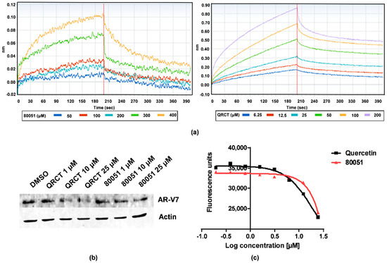 To quantify the ability of hit compounds to interact directly with hnRNP A1 RBD, the Bio-Layer Interferometry (BLI) technique was employed with purified UP1 domain of the hnRNP A1 protein (N-terminal residues 1-196) immobilized on a streptavidin biosensor (see Section 4.6 for details). Compound VPC-80051, as well as quercetin control, demonstrated direct binding to hnRNP A1 in a dose-dependent manner (Figure 3a).