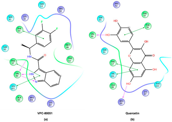 The docked structures were further minimized in implicit solvent and the binding free energies were calculated with the MM/GBSA method (molecular mechanics with generalized Born and surface area continuum solvent model) [50]. The estimated binding free energy of VPC-80051 obtained from MM/GBSA simulations was −60.7 kcal/mol relative to −57.9 kcal/mol for quercetin control. In these simulations in which the binding site residues were allowed to relax (i.e., protein flexibility within 5.0 Å from the ligand) during the minimization procedure of the complexes, VPC-80051 and quercetin maintained the protein-ligand interactions predicted by rigid docking (Figure 5).