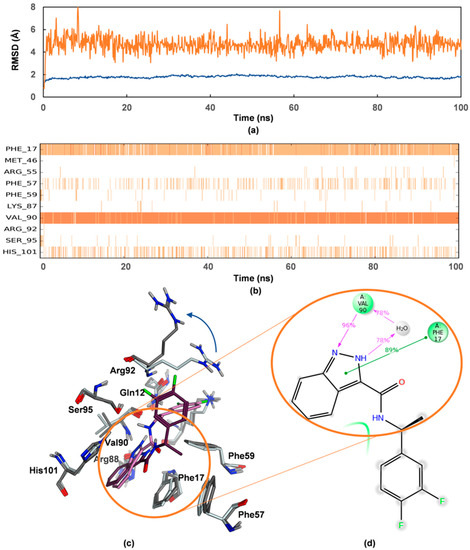 Computationally expensive molecular dynamics (MD) simulations were subsequently carried out to gain further insights into induced fit motions and solvent effects, and thus, the dynamic behavior of the hnRNP A1/VPC-80051 complex when fully subjected to force field in explicit solvent as opposed to the MM/GBSA implicit solvent approach. Analysis of the trajectory obtained from MD simulations (see Section 4.4) showed that VPC-80051 was stabilized for more than 30% of the 100 ns simulation time at greater than 80% strength mainly by hydrogen-bonding between its indazole moiety with Val90 backbone and π-π interactions with Phe17 (Figure 6). Superimposition of conformations of the simulated complex taken at different time steps revealed that the side chain of Arg92 underwent larger fluctuations relative to other side chains in the pocket (Figure 6c), opening and making the binding site more exposed to the solvent. As such, with more translational and rotational freedom, the difluorophenyl ring of VPC-80051 is no longer engaged in hydrophobic interactions with Arg92 side chain or π-π interactions with Phe59, and as such does not contribute substantially to the stabilization of the ligand. Future NMR spectroscopy or X-ray crystallography structural studies may unequivocally prove the binding mode of VPC-80051 to the hnRNP A1 RBD pocket.