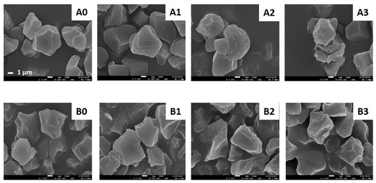 Scanning electron microscope images of OSA-modified Hopyeong (A) and Sinseonchal (B) rice starches (×7000). 1, 2, and 3 refer to the added percentages of octenyl succinic anhydride.
