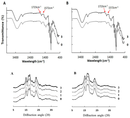 Fourier transform infrared spectroscopy and X-ray diffraction of OSA-modified. Hopyeong (A) and Sinseonchal (B) rice starches. 1, 2, and 3 refer to the added percentages of octenyl succinic anhydride.