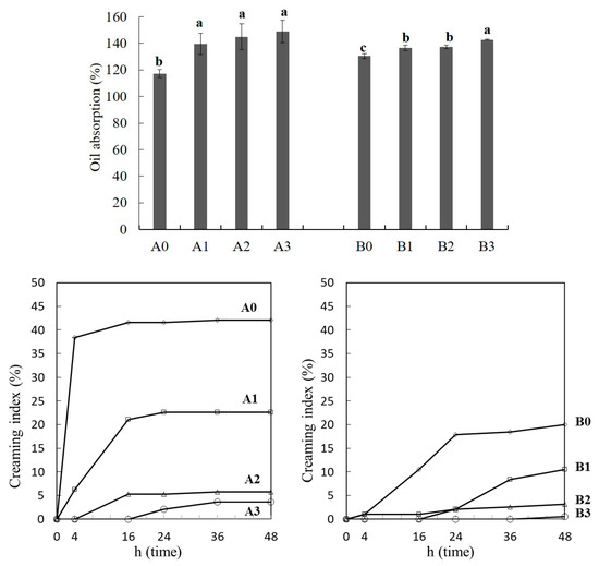 Oil absorption capacity and creaming index of OSA-modified Hopyeong (A) and Sinseonchal (B) rice starches. 1, 2, and 3 refer to the added percentages of octenyl succinic anhydride. Data represent as the mean ± SD; a–d Values accompanied in the same rice starch with different substitution ratios of OSA significantly differ (p < 0.05) by Duncan’s multiple range test.