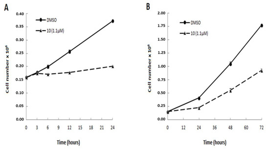 Effect of compound 10 on cell viability. Jurkat cells were treated with 1.1 μM compound 10 for different time periods ((A): 3, 6, 12, and 24 h; (B): 24, 48, and 72 h). Cell numbers were determined by Trypan Blue counting assays. Results are presented as means ± SD of three independent experiments.