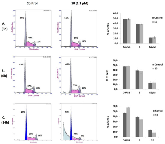 Cell cycle was assessed by flow cytometry using a fluorescence-activated cell sorter (FACS). Jurkat cells were plated in 6-well plates at a density of 1.6 × 105 cells, simultaneously with the addition of compound 10, at a concentration corresponding to its IC50 value at 72 h of treatment, or with only the vehicle, in a total volume of 2 mL of medium. The cells were allowed to incubate for 3, 6, and 24 h. After incubation, cells were collected and centrifuged. The supernatant was removed and the pellet was resuspended in 1 mL of TBS containing 1mg/mL PI, 10mg/mL RNase free of DNase, and 0.1% Igepal CA-630, for 1 h, at 4 °C. FACS analysis was performed at 488 nm in an Epics XL flow cytometer (Coulter Corporation, Hialeah, FL, USA). Data were collected and analyzed using the Multicycle software (Phoenix Flow Systems, San Diego, CA, USA). Three independent experiments were performed, with two replicates per experiment.