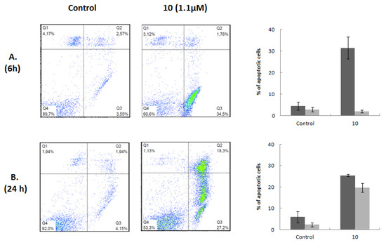Induction of apoptosis by compound 10. Flow cytometric quantification of apoptosis in Jurkat cells untreated (Control) or treated with 1.1 μM compound 10 for 6 (A) and 24 h (B). After treatment, cells were stained with annexin V-FICT/PI and analyzed by flow cytometry. A representative dot plot is shown for each time of incubation and condition; the right quadrants of each diagram (annexin+/PI− and annexin+/PI+) represent apoptotic cells. The percentage of early (dark gray bar) and late (light gray bar) apoptotic cells in each condition is represented as a bars diagram, calculated from dot plots. Results are presented as means ± SD of three independent experiments.