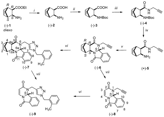 Reagents and conditions: (i) H2O, MW 100 °C, 30 min, 300 W, 90%; (ii) Boc2O, NaOH, dioxane/H2O, 0 °C, 30 min, r.t., 4 h, 87%; (iii) DIC, HOBt, propargylamine, THF, r.t., 24 h, 75%; (iv) 1. HCl/H2O 10%, r.t., 4 h 2. NaOH, H2O/CHCl3; (v) 2-formylbenzoic acid, pTSA, EtOH, MW, 100 °C, 30 min; 71%; (vi) 1. 2-methylbenzyl chloride, NaN3, Et3N, H2O/tBuOH, r.t., 1 h, 2. sodium ascorbate, (−)-6 or (−)-8, CuSO4, r.t. 8 h, 70–72%; (vii) MW, DCB, 220 °C, 60 min, 300 W, 70–72%.
