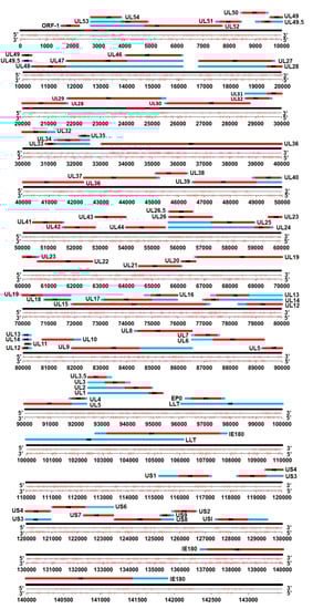 In the late stage, UL38, UL35, UL25, UL19, UL18, and UL6 encoded the proteins of the mature capsid constituents; these are required for the capsid assembly in the nucleus of the cell, and two scaffolding proteins (UL26 and UL26.5) have been reported to have participated in capsid formation [10]. The above late proteins accounted for 61% of the G2-PQSs in the late stage (Figure 3).