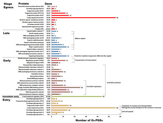 The G2-quadruplex formation in the open reading frame (ORF) of Epstein–Barr virus-encoded nuclear antigen 1 (EBNA1) led to decreased mRNA translation in the Epstein–Barr virus (EBV), which suggested that the G-quadruplex in viral transcripts acts as a specific regulatory element to regulate translation level and immune evasion [7]. The PRV replication cycle contains five main processes, including entry, immediate early stage, early stage, late stage, and egress [10]. There were 481 G2-PQSs in the ORFs of the genes in above five stages (Figure 3). 112 G2-PQSs were found in the entry stage, and 30 of them were involved in important envelope glycoproteins recognizing host cells. After the entry stage, PRV is in the immediate early stage. It transcribes and expresses only one immediate early gene, IE180; this was different from human herpesviruses, which transcribe three to five immediate early genes. IE180 is required for the effective transcription of early viral genes [10]. There were two copies of IE180 in the PRV genome, and 22 G2-PQSs were located in the coding sequence of each copy. The genes in the early stage contained 144 G2-PQSs, which was twice as many as the total number of G2-PQSs in the late stage (n = 77). The early-stage proteins had functions in transactivation and viral DNA synthesis, while the late-stage proteins were mainly responsible for DNA packaging and capsid maturation. A total of 104 G2-PQSs were identified in the egress stage, and most of them were present in the tegument proteins, which are important for virion formation before cell-to-cell movement (Figure 3).