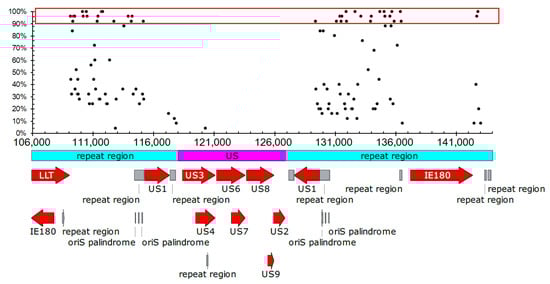 4 G2-PQSs were located in 0–656 bp region, and 208 G2-PQSs were located in the two regions between genes IE180 and US1 (Figure 4). The conservation percentage of 117 G2-PQSs on the sense strand of PRV genome ranged from 4% to 100% (Figure 5). There were 38 G2-PQSs in the repeated region between IE180 and US1 with conservation percentage more than 90% (Figure 5), including 11 G2-PQSs with 100% conservation rate (Table S1). These conserved GC-rich sequences might form G-quadruplexes in the inverted repeat region, mediating the genome recombination after infection. 14 G2-PQSs existing between IE180 and ORF1 may be switches of PRV replication in circular genome.