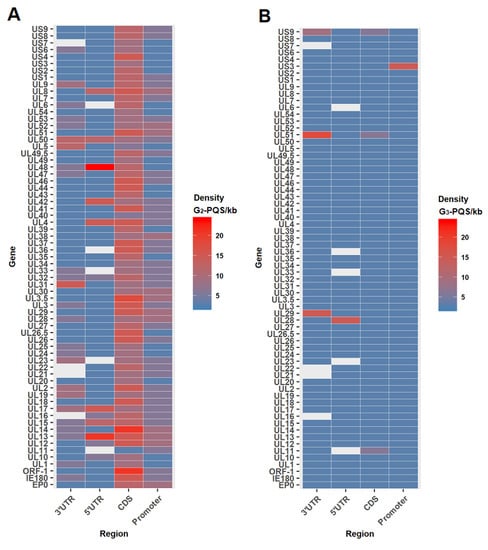 Heat maps of PQS density in coding sequence and regulatory regions of each PRV gene. (A) Heat map of G2-PQSs; (B) Heat map of G3-PQSs.