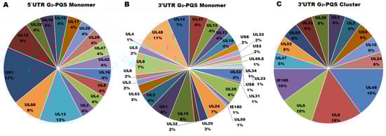 Quantitative distribution of G2-PQSs in the untranslated regions of annotated genes in PRV genome. (A) G2-PQS monomers in the 5′ UTR of the PRV genes. (B) G2-PQS monomers in the 3′ UTR of the PRV genes. (C) G2-PQS clusters in the 3′ UTR of the PRV genes.