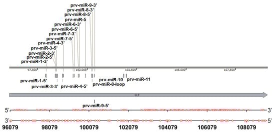 - Wang, X.; Zhang, M.M.; Yan, K.; Tang, Q.; Wu, Y.Q.; He, W.B.; Chen, H.C.; Liu, Z.F. The full-length microRNA cluster in the intron of large latency transcript is associated with the virulence of pseudorabies virus. Virology 2018, 520, 59–66. [Google Scholar] [CrossRef]