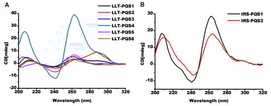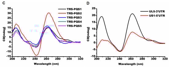 Circular dichroism (CD) spectra of G-quadruplex structures formed by selected oligonucleotides. (A) G2-PQS from the large latency-associated transcript (LLT) region. The LLT-PQS1 and LLT-PQS2 are located between the start site of LLT and the Prv-miR-1-5′; the LLT-PQS3, LLT-PQS4, LLT-PQS5, and LLT-PQS6 are located between Prv-miR-11-1 and the end of the LLT. (B) G2-PQS from the internal repeat sequence (IRS) region. The IRS-PQS1 and IRS-PQS2 are located between IE180 and US1. (C) G2-PQS from the terminal repeat sequence (TRS) region. TRS-PQS1, TRS-PQS2, TRS-PQS3, and TRS-PQS4 are located in the sequence complementary to US1 CDS; TRS-PQS5 is located between IE180 and US1. (D) G2-PQS from the untranslated region (UTR). The UL5-3UTR is from the 3′ UTR of the gene UL5; US1-5UTR is from the 5′ UTR of the gene US1.