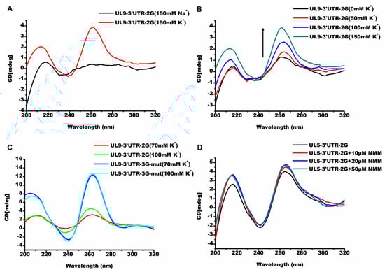 G2-PQSs from UL5-3′UTR and UL9-3′UTR are sensitive to cations and ligands. (A) CD spectroscopy of the G2-PQS (UL9-3′UTR-2G) in the presence of 150 mM NaCl or KCl. (B) CD spectroscopy of the G2-PQS (UL9-3′UTR-2G) with increasing KCl concentration (0–150 mM). (C) CD spectroscopy of G2-PQS (UL9-3′UTR-2G) and the G3-PQS mutant (UL9-3′UTR-3G-mut) with increasing KCl concentration (70–100 mM). (D) CD spectroscopy of the G2-PQS (UL5-3′UTR-2G) with increasing NMM concentration (10–50 μM).