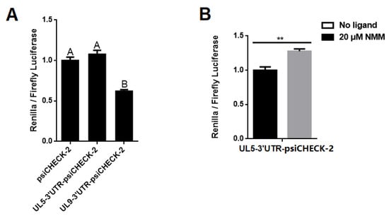 G2-PQSs from UL5-3′UTR- and UL9-3′UTR-regulated gene expression. (A) Dual-luciferase assay of G2-PQS from UL5 and UL9 in gene expression regulation. Different uppercase letters indicate the significant differences among the different constructs (p < 0.05, Tukey’s honestly significant difference (HSD) test) (B) Dual-luciferase assay of G2-PQS from UL5 in gene expression regulation with the ligand NMM. ** p < 0.01, Student t-test.