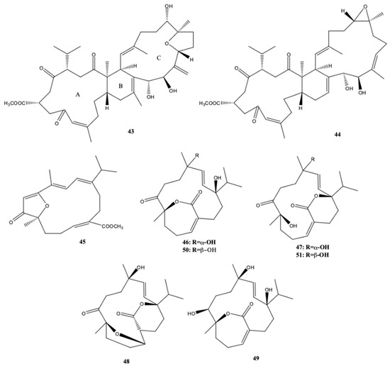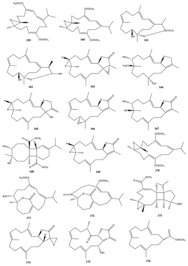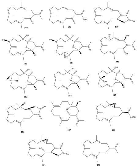 Rodrigues, I.G.; Miguel, M.G.; Mnif, W. A Brief Review on New Naturally Occurring Cembranoid Diterpene Derivatives from the Soft Corals of the Genera Sarcophyton, Sinularia, and Lobophytum Since 2016. Molecules 2019, 24, 781. https://doi.org/10.3390/molecules24040781