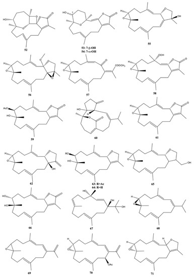 | Special cembranes | Secocembranes | Mayolide A (10) | Sinularia mayi | ![]() |