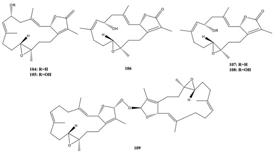 | Furanocembranoids | - | Pukalide (8) | Sinularia abrupt | ![]() |