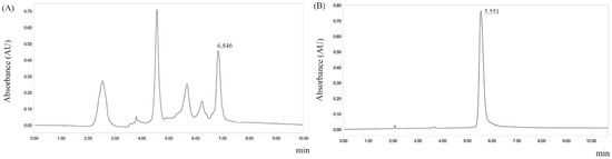 Chromatographic HPLC profiles of the subfraction F6AF and flavopereirine isolation of ethanolic extract from stem barks of G. vellosii. Condition: SunFire™ Prep. C18 OBD™ 5 µm 19 × 150 mm column, flow rate = 10.0 mL/min, temperature 18 °C. Mobile phase—t = 0 min: 80% water and 20% acetonitrile; t = 10 min: 80% water and 20% acetonitrile. (A) Chromatogram to subfraction F6AF; (B) flavopereirine-isolated G. vellosii.