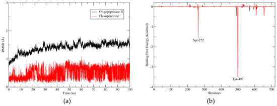 Molecular dynamics results. (a) RMSD x Time graphic of the molecular dynamics, with the black line representing the fluctuation of OpB and the red line the fluctuation of flavopereirine. (b) The main contributions to the binding free energy of each residue from OpB, mainly Ser-272 and Tyr-499.