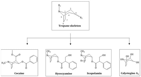 Alkaloids are naturally occurring compounds containing one or more nitrogen atoms. The name is derived from the basic nature of many members of this group, alkaloids from “alkaline-like”. The definition of alkaloids is complex as many nitrogen-containing molecules do not necessarily belong to this group. Biogenic amines or amino sugars, for example, are natural plant products and N-containing but not defined as alkaloids. Tropane alkaloids (TAs) are a specific class of alkaloid and can be more specifically defined as all molecules that possess a tropane ring system (Figure 1 Structure of the tropane skeleton (green box) and the three major groups of TAs derived from, green box) [].