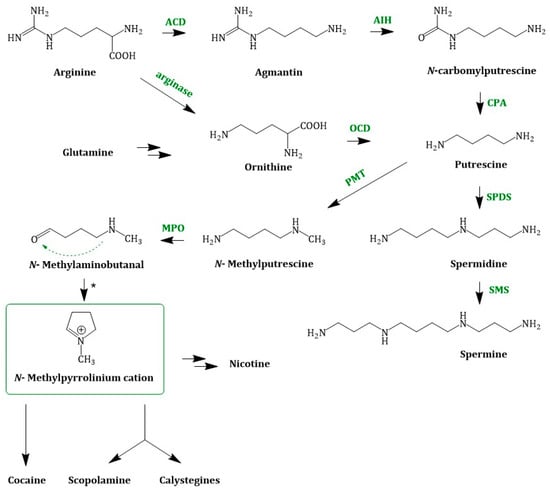 Putrescine can also be methylated to N-methylputrescine by the enzyme PMT (putrescine N-methyltransferase; EC 2.1.1.53) [] using SAM (S-adenosyl methionine). The next step in TA biosynthesis is the oxidative deamination of N-methylputrescine to 4-methylaminobutanal which is catalysed by a N-methylputrescine oxidase (MPO; EC 1.4.3.6) []. This diamine oxidase requires copper as a cofactor. N-methyl-Δ1-pyrrolinium, a central intermediate, is formed by spontaneous cyclization of N-methylputrescine. Chemically, this reaction is an intramolecular Schiff base formation. N-methyl-Δ1-pyrrolinium cation is a branchpoint in TA and nicotine biosynthesis []. In Figure 3. Joint steps of the early TA biosynthesis; ACD = arginine decarboxylase; AIH = agmatine deiminase; OCD = ornithine decarboxylase; CPA = N-carbamoylputrescine amidase; PMT = putrescine N-methyltransferase; SPDS = spermidine synthase; SMS = spermine synthase; MPO = N-methylputrescine oxidase; * = spontaneous cyclization, the joint biosynthesis is depicted. The condensation of nicotinic acid or more precisely its reactive derivate 2,5-Dihydropyrindine with N-methyl-Δ1-pyrrolinium cation yields nicotine.