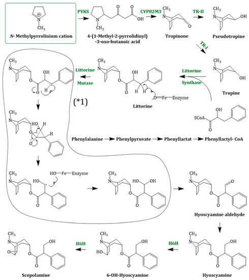 Scopolamine biosynthesis, starting with the N-methylpyrrolinium cation; PYKS = polyketide synthase; CYP82M3 = cytochrome P450 enzyme; TR-I/II = tropinone reductase I/II; littorine synthase (sequence not known); littorine mutase/monooxygenase (CYP80F1); (* 1) = proposed mechanism of littorine rearrangement; H6H = hyoscyamine 6β-hydroxylase.