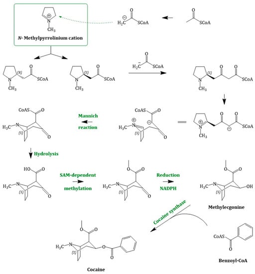 Cocaine biosynthesis (Figure 5), past its branch point with common intermediates shared with other TAs, is still under investigation and not fully elucidated. In literature, two different possibilities of the pathway towards cocaine biosynthesis have been reported. According to the classical hypothesis, the bridgehead carbon atom C-1 of methylecgonine is derived from an N-methyl-Δ1-pyrrolinium cation and that of C-2 originates from acetoacetate. However, feeding experiments with labelled N-methyl-Δ1-pyrrolinium cation were inconclusive in planta and could not confirm this theory. It was, therefore, suggested that the observed regiochemistry of incorporation of the labelled N-methyl-Δ1-pyrrolinium cation into cocaine was compatible with the stepwise introduction of C2 units into the ecgonine skeleton, derived from acetate []. Consequently, this hypothesis proposes a new intermediate in cocaine biosynthesis, N-methyl-2-pyrrolidineacetic acid. Although this compound was detected in several plants, all attempts at incorporation of it into the ester or thioester forms have been so far unsuccessful []. Chemically, nucleophilic addition of the first acetyl-CoA moiety reaction is assumed to be a Mannich-like reaction using the enolate anion; the side-chain extension occurs via Claisen condensation []. The (S)-enantiomer cyclizes and forms the bicyclic structure of the cocaine tropane ring skeleton by an intramolecular Mannich reaction []. Hydrolysis of the CoA-ester, followed by SAM-dependent methylation and reduction yield methylecgonine (2-carbomethoxy-3β-tropine). Methylecgonine in its turn condenses with benzoyl-CoA, which is derived from l-phenylalanine [], to cocaine. Schmidt et al. (2015) described an enzyme catalysing this reaction and termed it the cocaine synthase. This synthase belongs to the BAHD family, which catalyses the transfer of CoA-activated acyl thioesters to oxygen- or nitrogen-containing acceptor molecules [].