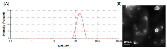 (A) Size distribution image of liposomes containing both phenethyl isothiocyanate (PEITC) and cisplatin (CDDP) (Lipo-PEITC-CDDP) and (B) SEM image of Lipo-PEITC-CDDP.