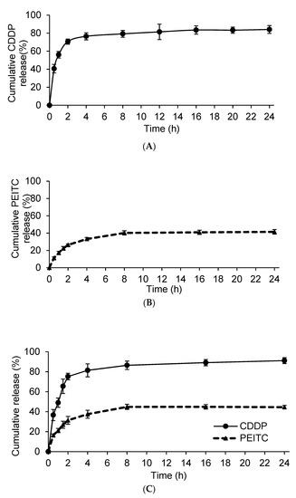 The percentage of release of CDDP or PEITC at different time points was calculated using the equation: