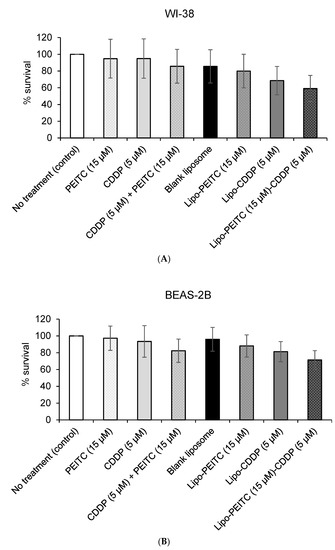 Percent survival of normal human lung cell lines (A) WI-38 (human diploid lung fibroblasts) and (B) BEAS-2B (human bronchial epithelial cells) treated with free cisplatin (CDDP) and phenethyl isothiocyanate (PEITC) and liposome-encapsulated compounds.