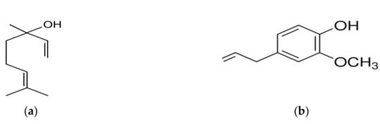 Linalool (Figure 1) is a monoterpene alcohol which occurs as one of its enantiomers in many EOs, where it is often the main constituent. For example, (−)-linalool occurs at a concentration of 80 to 85% in Cinnamomnum camphora oil, and rosewood oil contains around 80%. (+)-Linalool makes up 60 to 70% of coriander oil. Eugenol (Figure 1) belongs to the chemical group of phenyl propanoids and is the main constituent of several EOs; e.g., clove oil and cinnamon leaf oil may contain up to 90% eugenol [38].