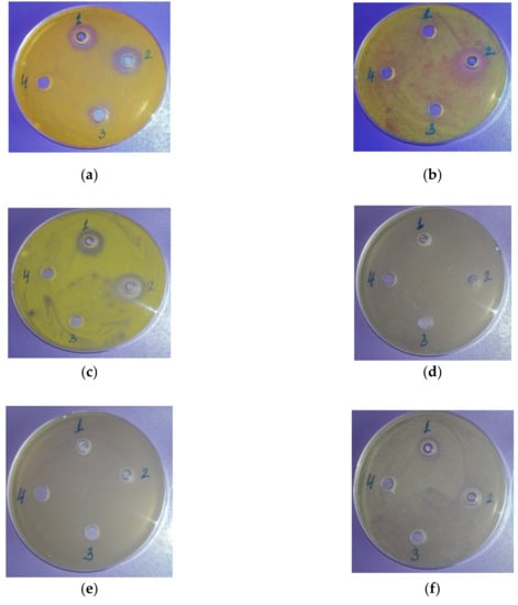 Antimicrobial activity of laurel (Laurus nobilis L.): (1) fruit EO; (2) leaf EO; (3) twig EO (solution in nonpolar solvent; (4) nonpolar solvent against: (a) Staphylococcus aureus; (b) Bacillus subtilis; (c) Kocuria rhizophila; (d) Escherichia coli; (e) Pseudomonas aeruginosa; (f) Salmonela abony
