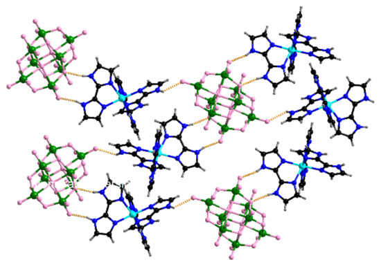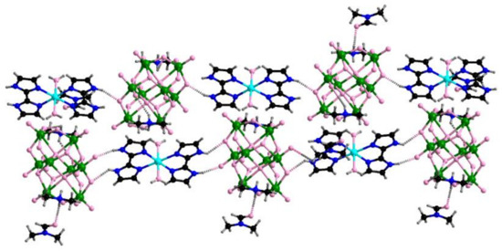 The structural view of H-bonds between neutral [Zn(H2biim)(DMF)3]2[Mo8O26] molecules in compound 4. The H-bond was shown in dashed line (Colors code: Mo—green; Zn—light blue; O—pink; N—blue; C—black; H—grey).