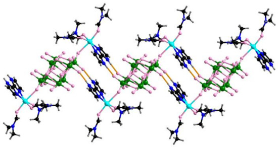 The structural view of 1D coordination chain of {[Cu(DMF)4]n[Mo8O26]n}2n− in compound 6. (Colors code: Mo—green; Cu—orange; O—pink; N—blue; C—black; H—grey).
