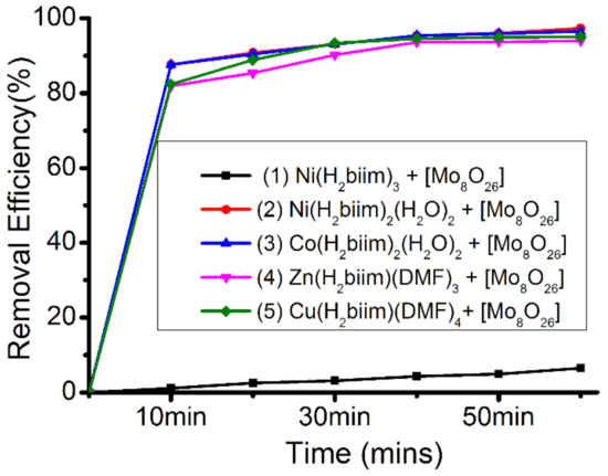 Towards developing POM-based hybrid absorbent materials with improved capacities and removal efficiency and understanding the adsorption process, we intend to simplify the model and use the classic β-octamolybdate as basic POM building unit to further explore the correlation between the adsorption and hybrid structures. The functional cations were used transition metal complexes about 2,2′-biimidazole ligand (H2biim). As an organic ligand, imidazole is a good electron donor for sp2 hybrid N atom in unsaturated system. It is able to coordinate to transition metals with three reversible types of binding: neutral (H2biim), monoanion (Hbiim−), and dianion (biim2−) types, but few compounds involving transition metals, H2biim ligands, and polyoxoanions have been reported [68,69,70]. The N–H bond of the ligand can form supramolecular compounds [71], which is beneficial to the ion-exchange and adsorption process of cationic dye in a wastewater. Herein, by adjusting the synthetic parameters and transition metal centers, six new polyoxometalate-complex nano-hybrids with different number of H2biim were isolated and characterized, including [Ni(H2biim)3]2[β-Mo8O26]•8DMF (1); (DMA)2[M(H2biim)2(H2O)2][β-Mo8O26]•4DMF (M = Ni (2), Co (3)) (DMA = dimethyl-ammonium); [M(H2biim)(DMF)3]2[β-Mo8O26]•2DMF (M = Zn (4), Cu (5)); [(DMA)2[Cu(DMF)4][β-Mo8O26]•2DMF]n (6) Complexes 2–5 show rapid and large-scale adsorption behaviors and good selective separation of cationic dyes. Meanwhile, the detailed complex structure indeed affects the adsorption efficiency and stability as expected. Particularly, compound 3 can uptake up to 521.7 mg g−1 MB+ cationic dye from a wastewater with excellent adsorbent efficiency, and performs the best among all the reported materials as far as we know. The primarily adsorption mechanism study indicated that the process is an ion-exchange process, and the adsorbed dyes can be easily desorbed. The compounds are quite stable and still work very efficiently after three cycles.