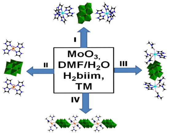 Accurate control of the synthesis of POM-complex hybrids is not always possible because many subtle factors of the experimental parameter may affect their assembly. In this work, complexes 1–6 were obtained under similar experimental conditions with different metal salts, resulting in noticeably different structures. MoO3 was used as Mo source instead of Na2MoO4 or (NH4)6[Mo7O24] to avoid an additional cation that could affect the self-assembly process and change the solubility of the complex hybrid. For dye sorbent material design, high temperature reactions in DMF/H2O mixture were used to form complexes with fewer coordinated water molecules in the final crystal structure. A lattice DMF with bigger size and weaker H-bond to POM unit may also benefit the adsorption/desorption process. The DMA cation comes from the thermal decomposition of DMF [72,73]. Further, the H2biim ligand can not only stabilize the transition metal center of the complex which further tune the solubility of the crystals, but also plays the role of proton donor and morphology-control-factor of the supramolecular structures. Additionally, although the H2biim ligands adopt unified bidentate ligand mode in compounds 1–5 and the POM units are strictly the same β-[Mo8O26]4−, parallel experiments indicated that the metal ions were crucial for the formation of the title complexes, as shown in Scheme 1. When NiII ion was used as central metal, the simple [Ni(H2biim)3]2+ cation was formed (compound 1). As the concentration of NiII and ratio of H2O/DMF increased, the cation forms [Ni(H2biim)2(H2O)2]2+ (compound 2) with two organic ligands and two water molecules. By replacing the NiII with CoII and changing the ratio of solvent to ligand, the CoII version analogue of 2 can be isolated as compound 3. Also, when ZnII ions or CuII was used instead of NIII ion, the metal ion coordinated with a single H2biim ligand, three DMF molecules and the β-[Mo8O26]4− in compounds 4 and 5. In the case of compound 6, the CuII coordinated with four DMF molecules and two β-[Mo8O26]4− units, and the compound was isolated as a by-product with compound 5. Clearly, it is believed that H2O, DMF and H2biim are competitive ligands in this synthetic system, and the fine-tuning structure of the POM-complex hybrid could be realized by simply adjusting the concentration of reactant and the reaction solvent.