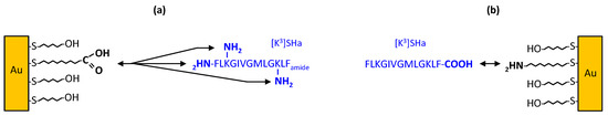 Different grafting strategies of SHa analogs. (a) Grafting of C-terminal α-carboxamidated SHa analogs on carboxylic acid-terminated MUA SAMs. (b) Grafting of free C-terminal carboxylate SHa analogs on amine-terminated MUAM SAMs. Reactive functions of the MUA/MUAM SAM and of [K3]SHa are indicated in bold.