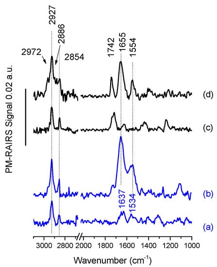 The PM-RAIRS spectra of gold surfaces modified by carboxylic acid and amine thiols, and the corresponding temporins are presented in Figure 2.