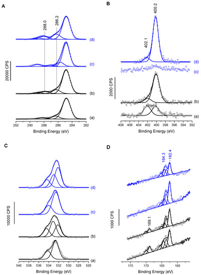 XPS analyses were performed using an Omicron Argus spectrometer (Taunusstein, Germany) equipped with a monochromated AlKα radiation source (hν = 1486.6 eV) working at an electron beam power of 300 W. Photoelectrons emission was analyzed at a takeoff angle of 90°; the analyses were carried out under ultra-high vacuum conditions (≤10−10 Torr) after introduction via a loadlock into the main chamber. Spectra were obtained by setting up a 100 eV pass energy for the survey spectrum and a pass energyof 20 eV was chosen for the high resolutions regions. Binding energies were calibrated against the Au4f7/2 binding energy at 84.0 eV. Element peak intensities were corrected by Scofield factors [47]. Casa XPS v.2.3.15 software (Casa Software Ldt, Teignmouth, UK) was utilized to fit the spectra and Gaussian/Lorentzian ration was applied (G/L ration = 70/30).