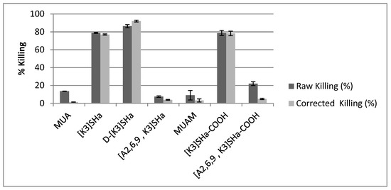However, electron microscopy does not constitute a direct proof of bacteria viability or death, and most importantly does not provide a quantification of the potential antibacterial efficiency of the modified surfaces. Conversely, bacteria were also cultivated on agar plate after having been in contact with the modified surfaces in order to count the actual number of viable bacterial colonies compared to bare gold surfaces. Results showing the %killing of the different grafted surfaces are summarized in Table 3, and are also presented in Figure 5 as dark bars under the label “raw killing”. At first glance, it is clear that there are three modified surfaces that exhibit high bactericidal efficiency with killing percentage around 80%, namely L- and D-[K3]SHa as well as [K3]SHa-COOH, which confirms what was observed by SEM-FEG. It is also worth noting that both anchoring primers (MUA and MUAM) show little bactericidal activity, around 13% and 9% respectively. Although, the surface modified with [A2,6,9, K3]SHa reveals only 7% of killing, as expected from the MIC/MBC values presented in Table 1, it is more unexpected to see the [A2,6,9, K3]SHa-COOH modified surface displaying a killing activity superior to 20% (Table 4).