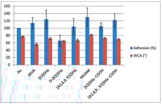 Bacterial adhesion was then measured for all surfaces and normalized to the adhesion on bare gold (Table 4 and Figure 6). First, both primers (acid and amino thiols) showed an increase in adhesion compared to the gold reference, which in these two cases can be correlated with the wettability (72° for MUA and 82° for MUAM) and the charges (−1 for MUA and +1 for MUAM) of the surfaces with respect to the bacterial solution. However when looking at the adhesion for L-temporin analogs, values are ranging from 104% to 124%. These variations cannot really be explained by looking at the different parameters of each analog. For instance, there was a 20% decrease of the adhesion between [K3]SHa and [A2,6,9, K3]SHa for the same net charge of the peptide (+3) and the same surface density (~1 pept/nm²) and a similar wettability with WCA of ~70°. The tendency was the opposite when looking at the SHa-COOH analogs with an increase this time of around 20% from [K3]SHa-COOH to [A2,6,9, K3]SHa-COOH analogs although very similar WCA were again observed. However, one striking result was the decrease of the bacterial adhesion by more than 50% obtained for the all-D enantiomer D-[K3]SHa compared to the “natural” enantiomer [K3]SHa. This last result was clearly linked to the molecular interaction between bacteria and the temporin-modified gold surface containing two different L/D configurations, showing that the adsorption/adhesion processes of bacteria are somehow linked to molecular recognition and in this case to chiral recognition.