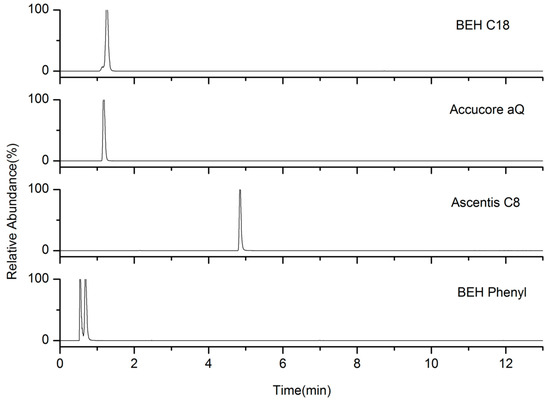 Chromatographic conditions were studied in order to obtain the best separation and retention for the compounds. Four HPLC columns (Waters ACQUITY UPLC® BEH C18 (1.7 μm, 50 × 2.1 mm, Milford, MA, USA), Thermo Accucore aQ (2.6 μm, 150 × 2.1 mm, Bellefonte, PA, USA), ALDRICH Ascentis® C8 (3 μm, 10 cm × 4.6 mm, Bellefonte, PA, USA), Waters ACQUITY UPLCTM BEH Phenyl (1.7 μm, 50 × 2.1 mm, Milford, MA, USA) were evaluated in (0.1% FA) H2O-MeCN in their appropriate gradient elution at 0.5 mL min−1. Similar separation performances for total analytes were observed by the first three columns; however, the Ascentis® C8 column provided better shape and retention for hydroxyatenolol, as shown in Figure 1. Therefore, the Ascentis® C8 column was chosen.
