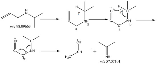 It is worth mentioning that the Υ-H of the amine structure with 1-propene (C6H12N at m/z 98.09663) rearranged to an unsaturated group, accompanied with the cleavage of the β-bond in the amine structure to produce the McLafferty Rearrangement. Imine structure of the fragment C3H7N (at m/z 57.07101) was produced by this reaction. The mechanism of the McLafferty Rearrangement reaction is shown in Figure 5.