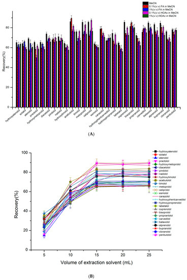 For food samples, MeCN was commonly used as the extraction solvent due to its protein precipitation ability. Since the acetic-buffer could be used to increase the recoveries of pH-dependent compounds, pure MeCN and different contents of acids (0.1% HOAc, 1% HOAc, 0.1% FA, 1% FA, v/v) in MeCN were compared for extraction efficiency in this study. For extraction solvents containing HOAc or FA, the recoveries of some analytes (such as sotalol, hydroxymetoprolol, labetalol, epractolol and hydroxytimoloven) were lower than 60%, as can be seen in Figure 7A. Pure MeCN provided better extraction efficiency with all analyte recoveries being higher than 65%; therefore, pure MeCN was found to be the most suitable extract solvent. Then, the solvent volume was investigated for optimization of the recoveries of the targets. It can be observed in Figure 7B that the recoveries of analytes increased with the solvent volume. When the solvent volume reached 15 mL, recoveries began to be stable. In order to ensure the stability of the recoveries, 20 mL extract solvent was chosen to extract all analytes.
