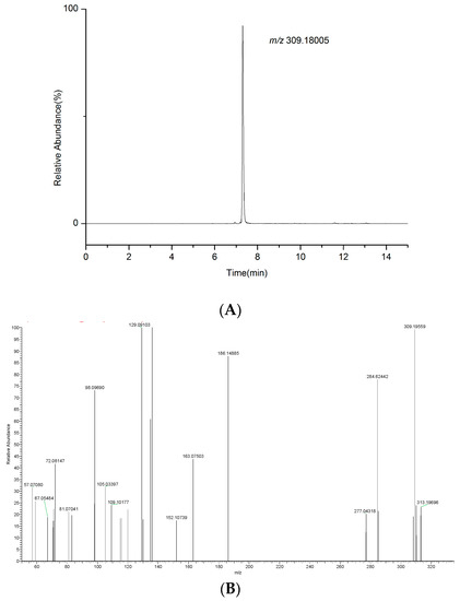 In order to estimate the reliability and practicability of the developed method, 30 samples of infant formula milk powder purchased at local markets were analyzed in this study. The samples were regarded as representative, since they were ranged from phase 1 to stage 4 produced by reputable manufactures. High accuracy parent ions and product ions were used for qualitative analysis simultaneously. Full MS data of this mode were used for quantitative analysis. None of the 27 targeted analytes were detected by the developed Q-Orbitrap high resolution mass spectrometry method. However, an unknown compound which has the same molecule mass (m/z 309.18005) but different retention time (7.15 min vs. 5.75 min) with diacetolol has been screened in one sample. As shown in Figure 8, under the MS2 conditions, the detected unknown compound had high-accuracy product ions 98.09692 (m/z) and 72.08157 (m/z), which was similar to diacetolol, and also the characteristic fragment ion m/z 57.07080. So, it is reasonable to speculate that this unknown substance may be an isomer of diacetolol. Considering the possible structure of product ions, the detected diacetolol’s isomer could have two possible chemical structures (C16H25O4N2), as shown in Figure 9. For the first one, the acetyl group on the phenyl ring is in the presence of an acetyl amino group, which is more likely. The reason for this is that intermediate isomers are produced during the synthesis process, resulting in the isomerism of the target compounds. The second possibility may be diastereoisomers. Imino NH, phenolic hydroxyl oxygen and carbonyl oxygen through hydrogen bonding make the nitrogen atom form a relatively stable chiral center, as shown in Figure 9B. The specific structure needs to be further confirmed by NMR or other techniques.