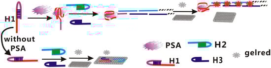 The principle diagram is shown in Figure 1. This assay contains 3 ssDNA: H1, H2, and H3. As shown in Figure 1, the H1 sequence was composed of two parts: The red part was the PSA sequence, and the other part (lilac) contained a trigger sequence of HCR reaction which is complementary with part of H2 on the 5′ terminal, and 9 successive adenine bases to reduce any possible steric hindrance effects. In the absence of PSA, these 3 ssDNAs can coexist in solution, in the form of hairpins. When GelRed was added, a strong fluorescence signal emerged; but the fluorescence signal became very weak after adding GO. This is ascribed to the fact that the 3 ssDNAs were adsorbed on the GO surface through their sticky ends and loops. In the presence of PSA, the PSA can bind with the aptamer sequences of H1 to form a PSA–aptamer complex. Hence, the trigger sequence was exposed and hybridized with the sticky end of H2, resulting in an opening up of the hairpin of H2. The formed exposed sequence of H2 hybridized with the sticky end of H3, leading to an opening up of the hairpin of H3. The hybridization processes are repeated alternatively and a long-nicked dsDNA molecule forms. When GelRed and GO are added, a strong fluorescence signal appears, because the long-nicked dsDNA molecule has very weak affinity with GO. In such a way, the detection of PSA can be realized.