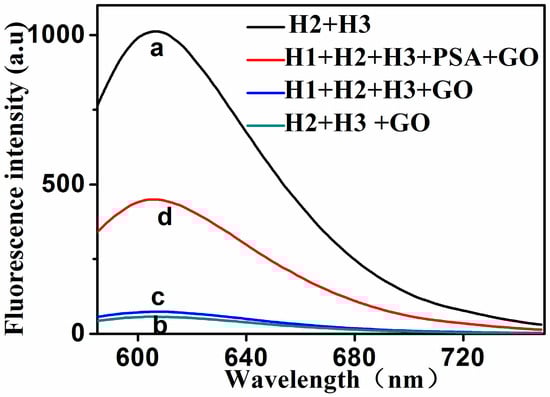 The typical fluorescent emission spectra of different mixtures solution. The mixture solutions, for curves a to d, are: (a) H2 + H3; (b) H2 + H3 + GO; (c) H1 + H2 + H3 + GO; and (d) H1 + H2 + H3 + PSA + GO. The concentrations of H1, H2, H3, GO and target (PSA) were 20 nM, 30 nM, 30 nM, 15 μg·mL−1 and 5 ng·mL−1, respectively.