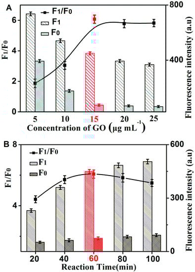 The fluorescence signal in the presence of H1 H2, H3, and GelRed can be effectively quenched by GO, which is vital in the design of the HCR/GO/GelRed assay. The relationship between the fluorescence change and the concentration of GO is shown in Figure 3A. The value of F1 and F0 obviously decreased with an increase in the concentration of GO. The value of F1/F0 was at maximum value when 15 μg/mL GO was added. This value was, therefore, selected to be the optimal GO concentration. The reaction time of HCR also had an important effect on fluorescence intensity. The values of F1 and F0 increased with longer reaction times (as shown in Figure 3B). The maximum F1/F0 value was obtained when reaction time was 60 min. So, 60 min was selected to be the optimal HCR reaction time for the rest of the experiments. F1 and F0 is the fluorescence values at 606 nm in the presence and absence of PSA, respectively.